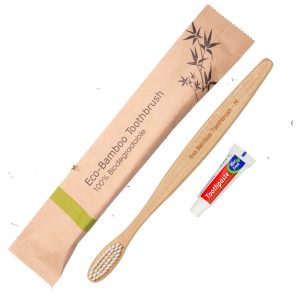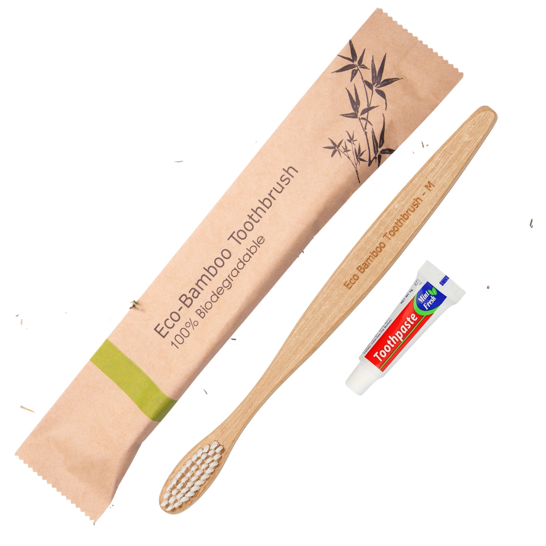 Eco-Bamboo Toothbrush (Adult Medium) packaged in recyclable Kraft Packaging and Colgate 50ml Toothpaste